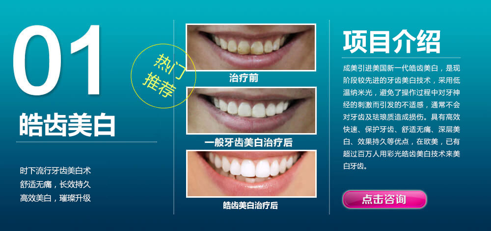 A:成美牙齿美白技术治疗过程温和舒适。能避免治疗过程中对牙神经的刺激,通常基本不会对牙龈牙齿结构造成伤害。